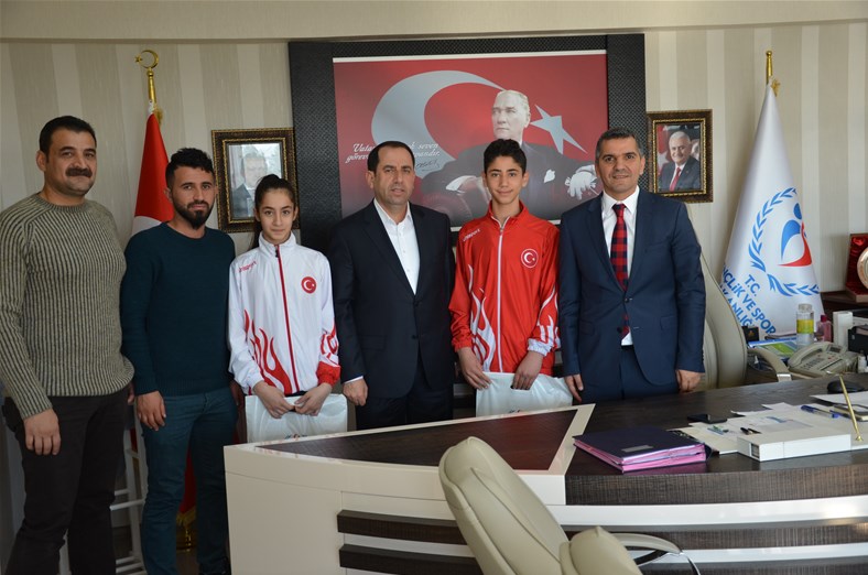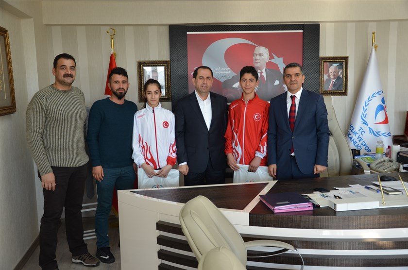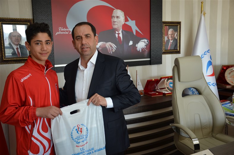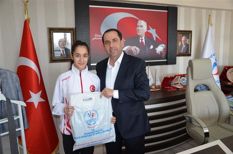 Çek Cumhuriyetinde yapılan 9. Shotokan Avrupa Karate şampiyonasında Diyarbakır’ımızı Milli Takımda başarılı bir şekilde temsil eden Sena KIZILASLAN Yıldız Bayanlar 43 kg da altın madalyanın sahibi olurken diğer milli sporcumuz Muhammet Yusuf YAZAR ise Genç Erkekler 55 kg da bronz madalyanın sahibi olan sporcularımız ile Antrenörleri Ahmet Yazar ve kulüp başkanı Şehmus Kızılaslan’ı makamında kabul eden İl Müdürümüz Mehmet DEMİR, Başarılı Milli sporcuları eşofman takımı ile ödüllendirildi.